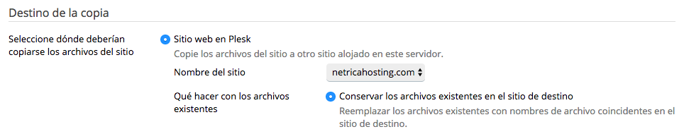 4. En el siguiente apartado deberás indicar el destino de la copia (el subdominio que hayas creado anteriormente). Selecciona la opción “Conservar los archivos existentes en el sitio de destino”.