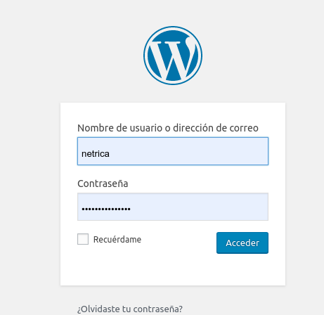 Ya puedes acceder. Coloca en tu navegador la URL de acceso a tu wp-admin (por ejemplo netrica.es/wp-admin) y espera a que aparezca la siguiente pantalla: