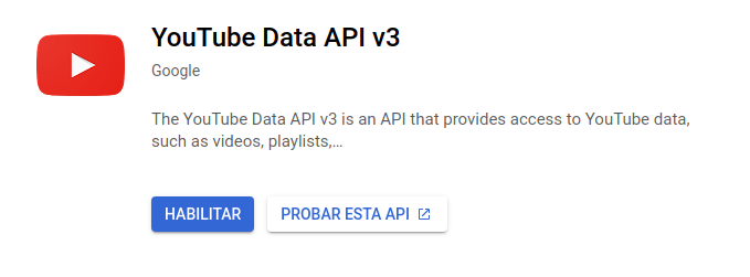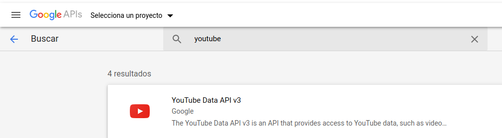 2.- Desde el buscador localizado en la parte superior de la sección, escribe «Youtube» y te aparecerá en pantalla varias opciones. Haz click sobre la opción «YouTube Data API v3«.