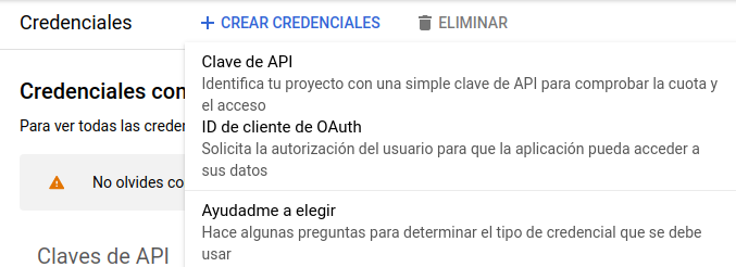 5.- Pulsa sobre la opción «+ CREAR CREDENCIALES -> Clave de API«.