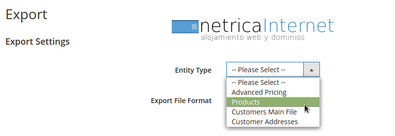 2) Desde el apartado «Entity Type» selecciona la opción «Products» y elige el formato deseado (Preferentemente CSV).