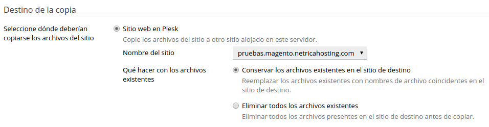 Si el dominio o subdominio dónde vas a copiar el contenido tiene ya archivos, te aconsejamos que marques la casilla «Eliminar todos los archivos existentes».