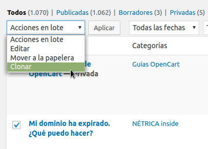 Marca la casilla perteneciente a la o las entradas que quieras clonar y despliega el apartado «Acciones en lote». Pulsa sobre el botón Clonar.