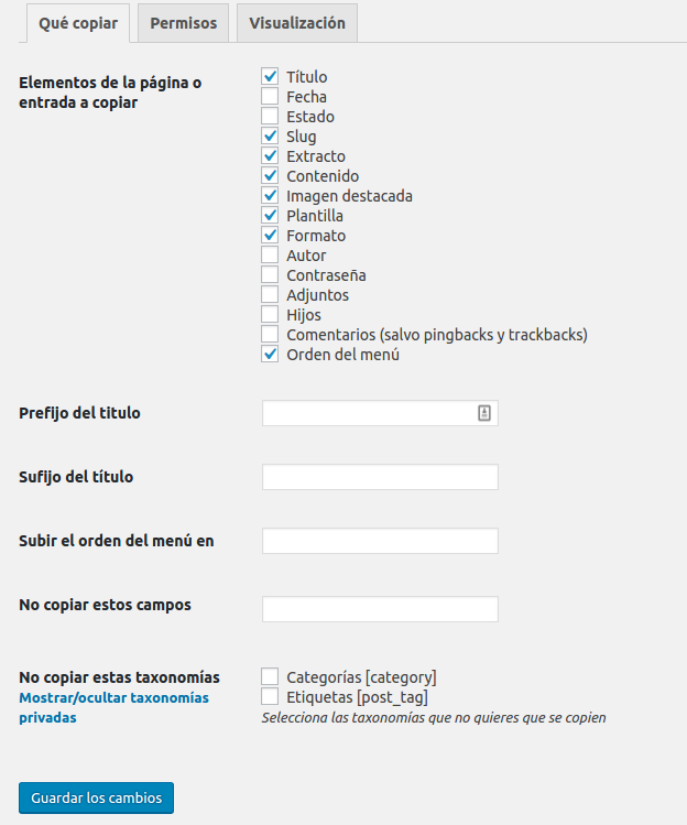 Nota importante: para configurar tu plugin (elementos que clonar o no clonar, opciones en los títulos, permisos de acciones, entre otras características) accede dentro de tu panel administrativo a la opción Ajustes -> Duplicate post