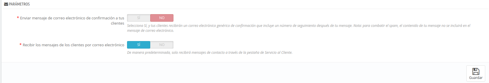 3.- Seguramente en el siguiente apartado tengas todas las opciones deshabilitadas, y es por ello el motivo por el cual no te llegan los correos del formulario de contacto en PrestaShop. Simplemente deberás marcar en «SI» la opción «Recibir los mensajes de los clientes por correo electrónico» y guardar los cambios.