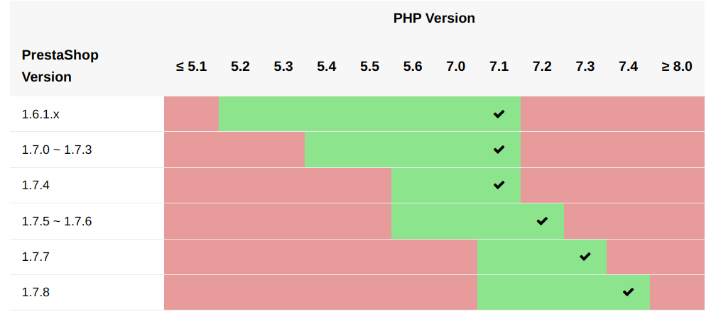 En cada versión de Prestashop se define una serie de requisitos de compatibilidad, por ejemplo versión de MySQL, versión de librerías concretas del sistema, pero más importante, la versión de PHP. La versión de PHP ideal para tu Prestashop está determinado por la documentación oficial, donde se encuentra el siguiente cuadro de compatibilidad: