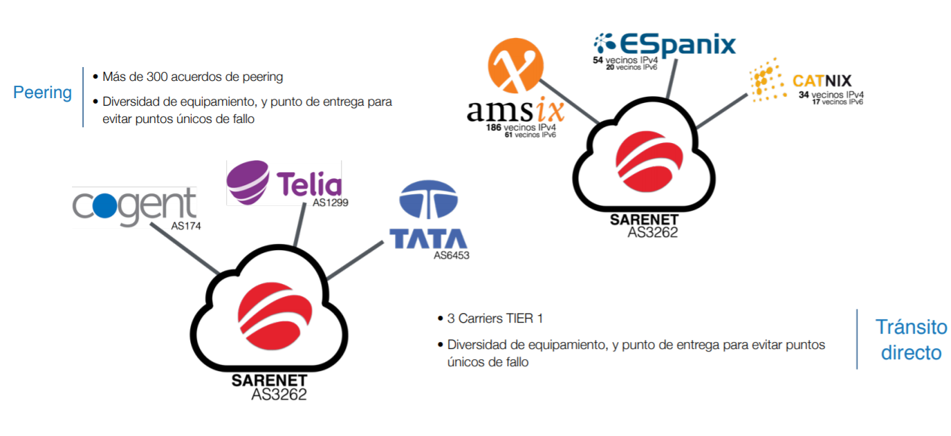 Nuestra red en España cuenta con múltiples proveedores de tránsito, 300 acuerdos de peering (incluyendo Telefónica), diversidad de equipamiento y punto de entrega para evitar puntos únicos de fallo.